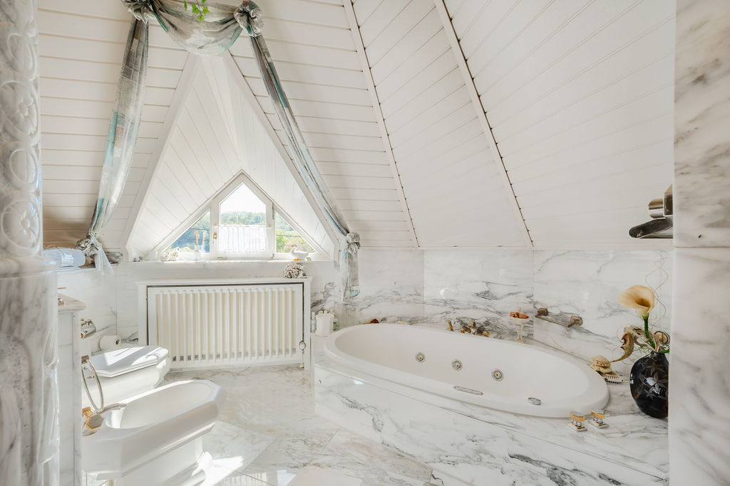 Ursprünglich im Jahr 1960 errichtet und seither mit Bedacht und Stil erweitert (1985 bis 1995), verbindet diese Unternehmervilla das Beste aus mehreren Jahrzehnten: massive Bauweise, großzügige Raumkonzepte und eine Ausstattung, die auch heute noch durch Qualität überzeugt. Vom imposanten Bruchsteinerker, der dem Gebäude einen fast herrschaftlichen Charakter verleiht, über das elegante Marmorbad mit Sauna bis hin zu den stilvollen Vollholztüren – hier zeigt sich Individualität bis ins Detail.