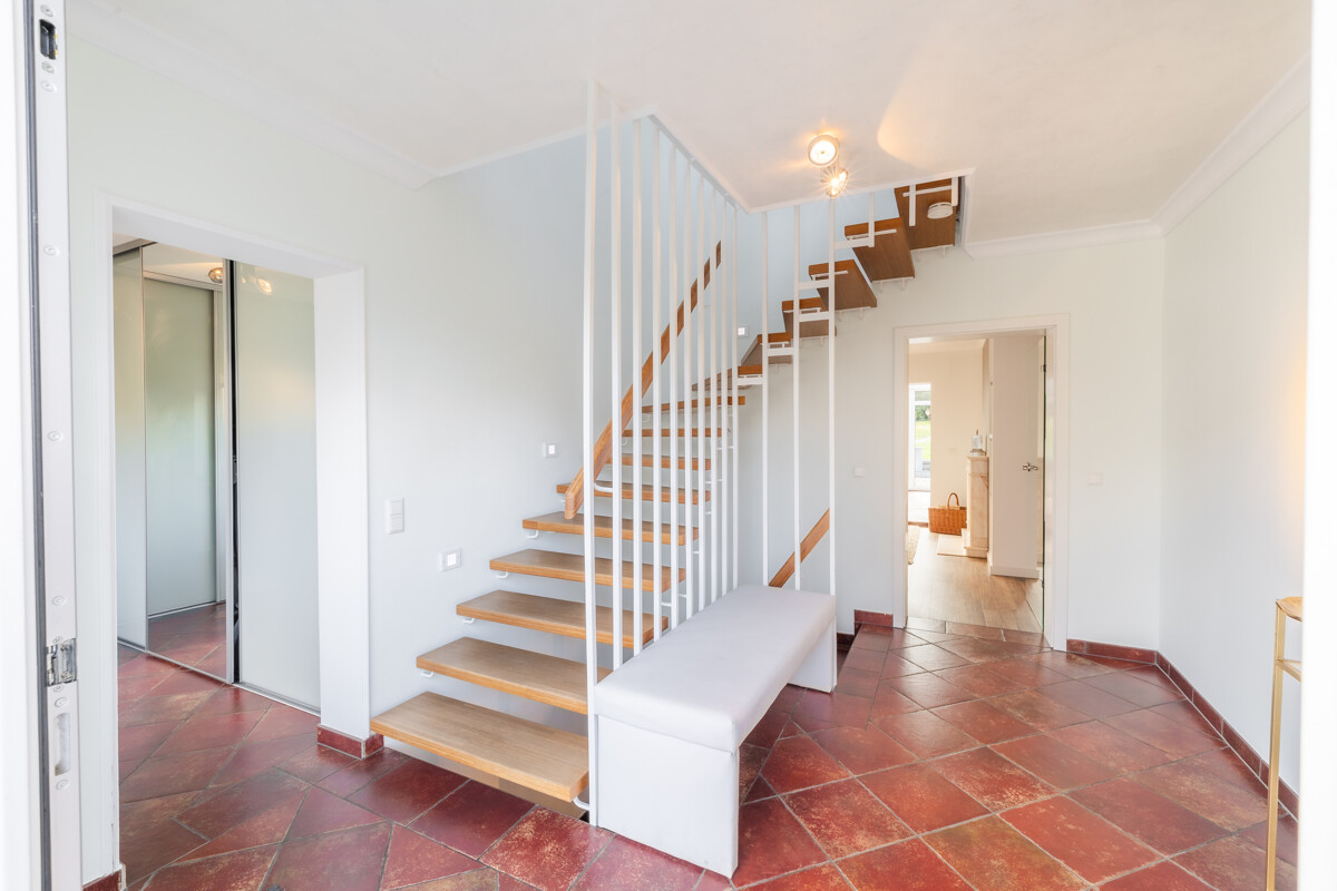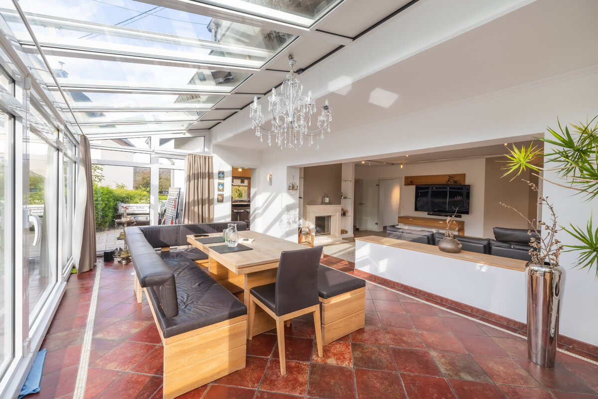 Schon beim Eintreten spürt man die besondere Atmosphäre: Der freundliche Eingangsflur mit angrenzender Garderobe öffnet den Blick in den lichtdurchfluteten Wohnbereich, der durch seinen gemütlichen Kamin und den angrenzenden großzügigen Wintergarten eine einladende, fast schon naturverbundene Wohnqualität bietet. Hier verschmelzen innen und außen – zu einem Platz, an dem man zu jeder Jahreszeit gerne verweilt. Für ein zusätzliches Gefühl von Sicherheit sorgt eine moderne Alarmanlage, die sämtliche Fenster und Türen überwacht und somit Komfort und Schutz harmonisch miteinander verbindet.