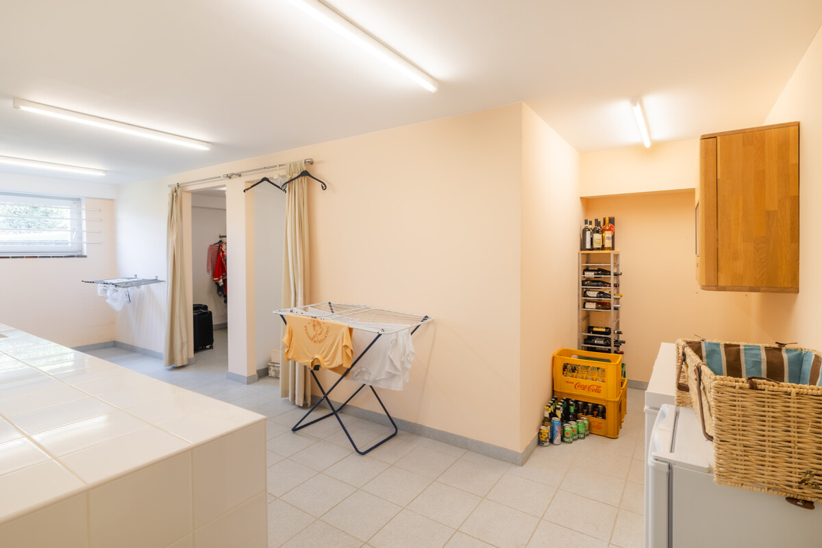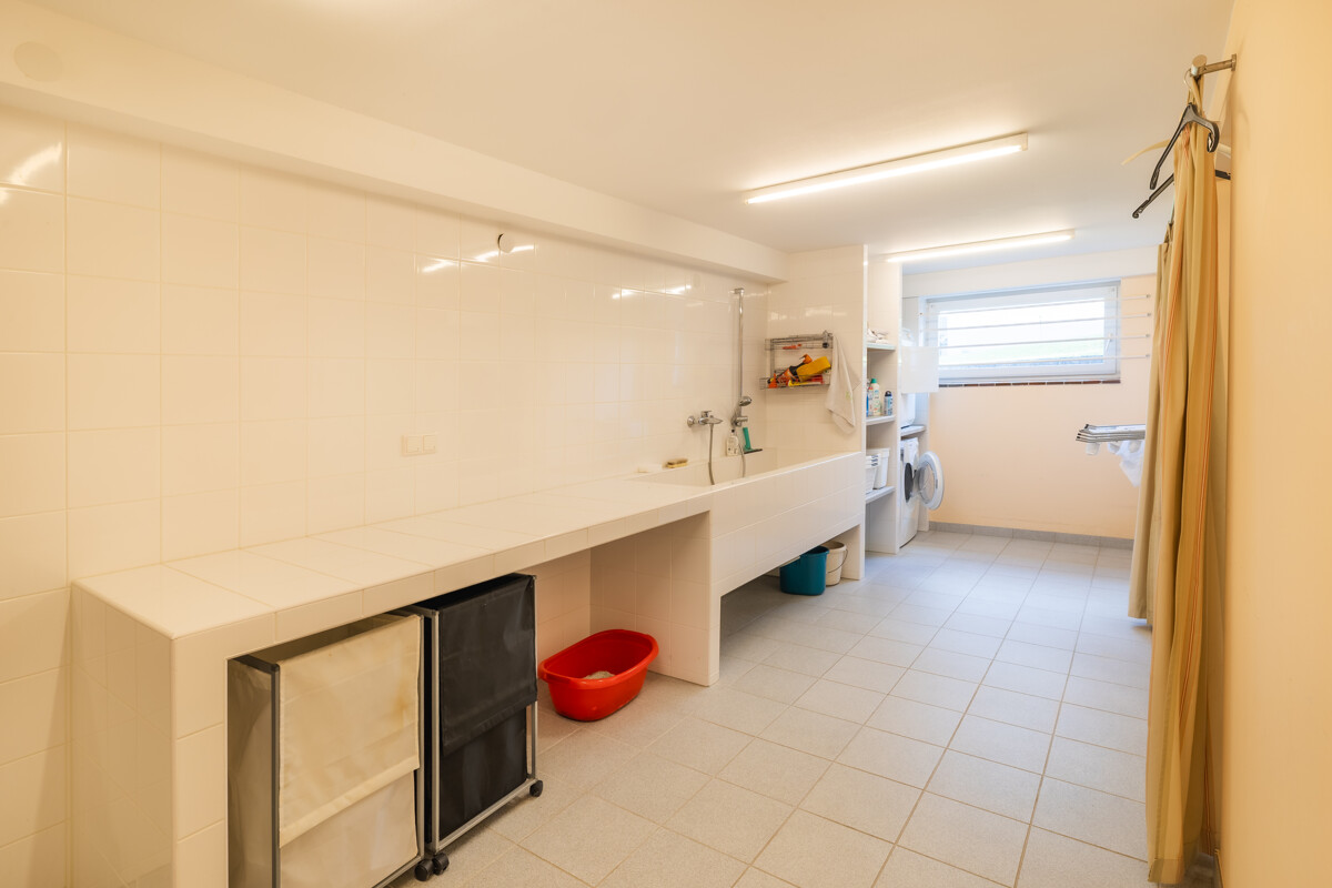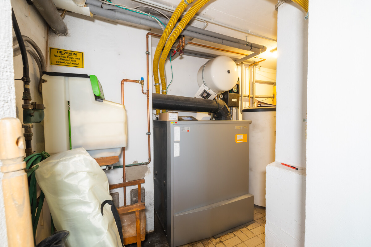 Auch das Kellergeschoss präsentiert sich gepflegt und modern: Ein großer Waschraum, zusätzliche Abstellflächen und der Heizungsraum mit effizienter Holzpellets-Heizung sorgen für Komfort und Funktionalität.