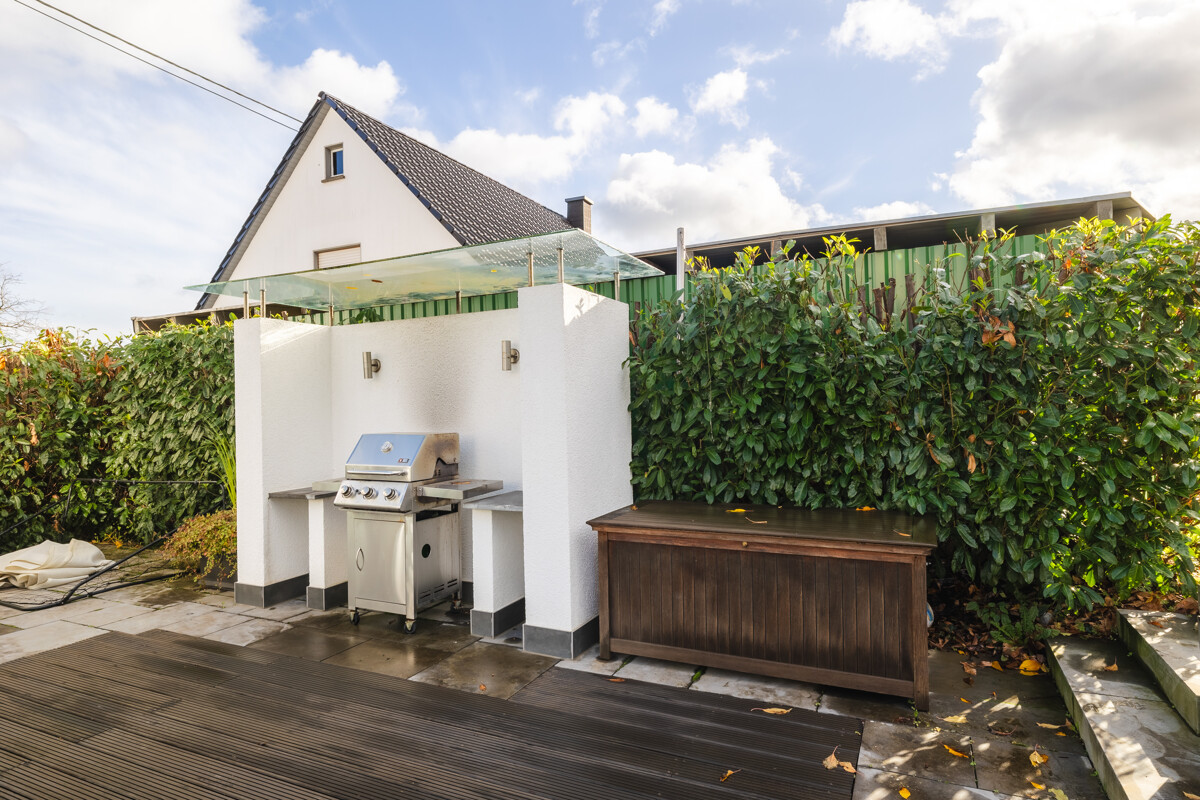 Der neu gestaltete Garten ist ein echtes Highlight: Eine weitläufige Terrasse direkt am Wintergarten, eine gemütliche Grillecke und viel Raum zur individuellen Gestaltung eröffnen vielfältige Möglichkeiten für entspannte Stunden im Freien. Im oberen Gartenbereich befindet sich zudem ein Freisitz, der sich ideal für eine stilvolle Lounge eignet. Eine Natursteinmauer verleiht dem Garten Struktur und Charakter, während ein großes Gartenhaus praktischen Stauraum und zusätzliche Nutzungsmöglichkeiten bietet. Das Carport mit Platz für zwei Fahrzeuge rundet dieses attraktive Gesamtpaket ab.