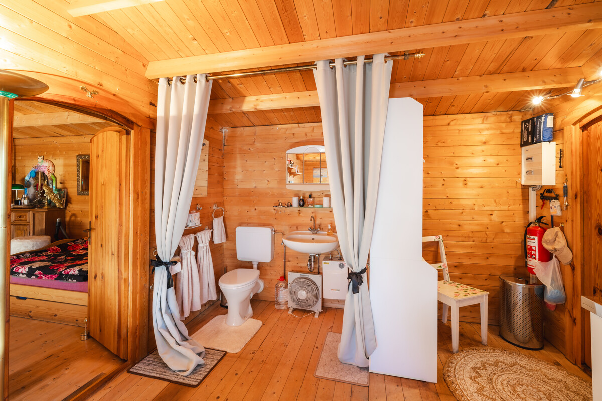 Beim Betreten des Hauses empfängt Sie ein einladender Wohnraum, der durch eine praktische Küchenzeile ergänzt wird. Die Holzausstattung verleiht dem Raum eine warme und einladende Atmosphäre. Ein separates Schlafzimmer bietet Platz für erholsame Nächte. Das Badezimmer ist funktional mit Toilette und Waschbecken ausgestattet.