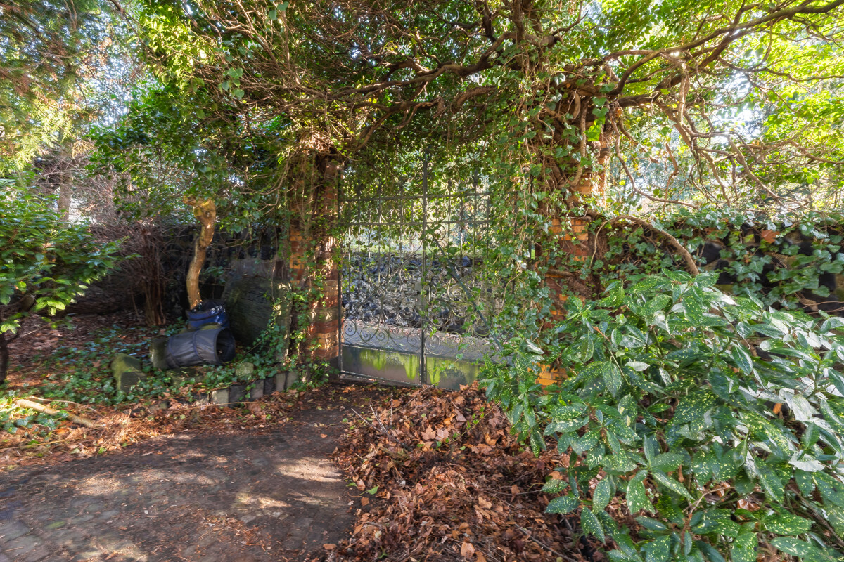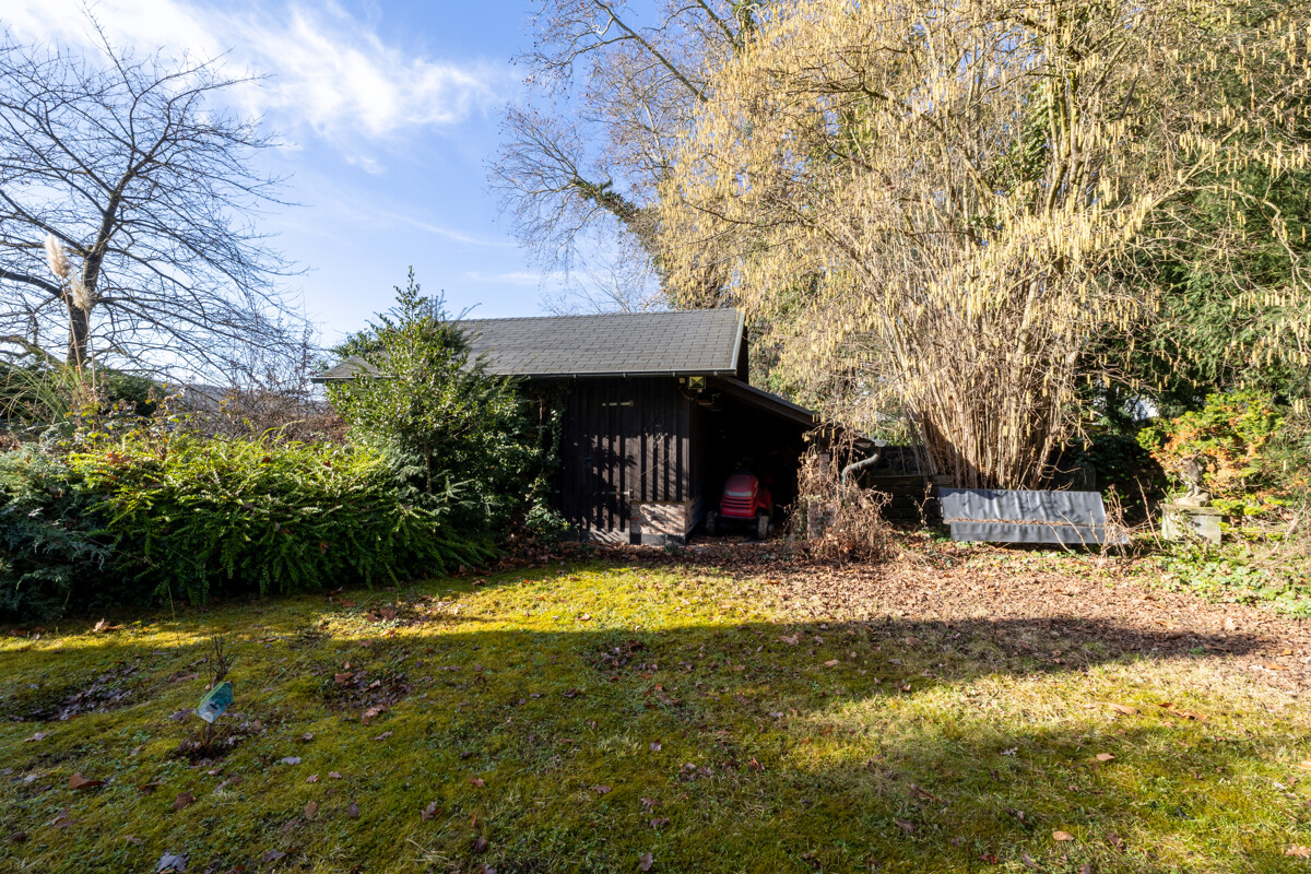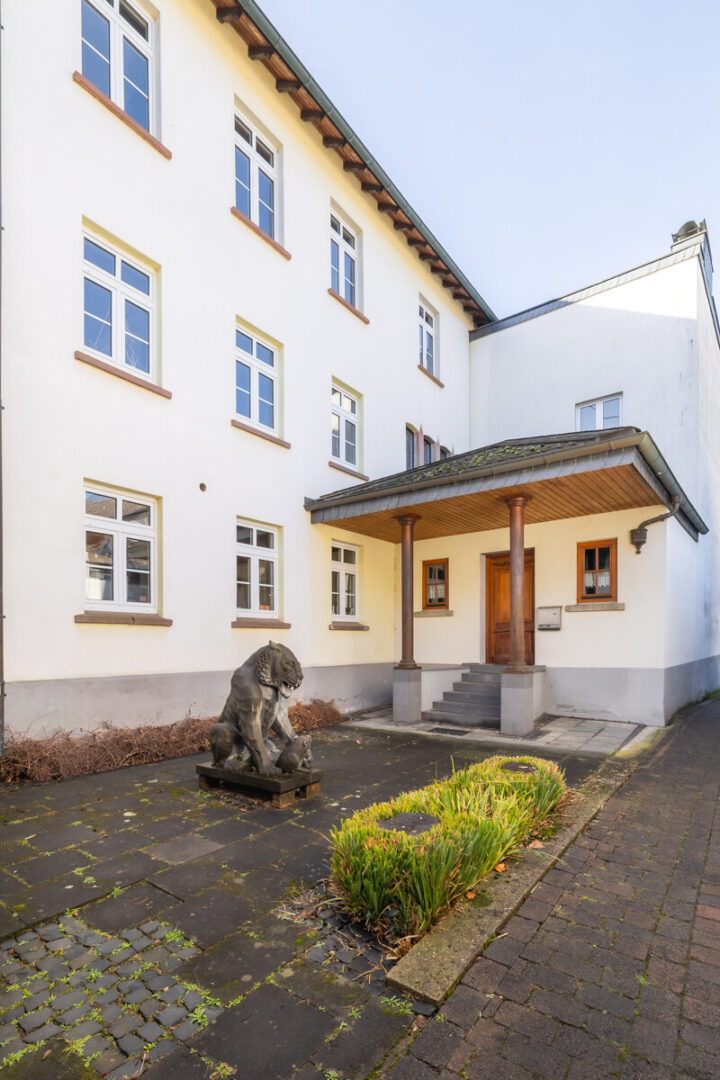 Hinter der zurückhaltenden Straßenansicht öffnet sich ein parkähnliches Grundstück, das den Blick einerseits auf die freistehende Villa und andererseits in Richtung Rhein freigibt. Hier erschließt sich die besondere Atmosphäre dieses Ortes: ruhig, gewachsen und angenehm privat.