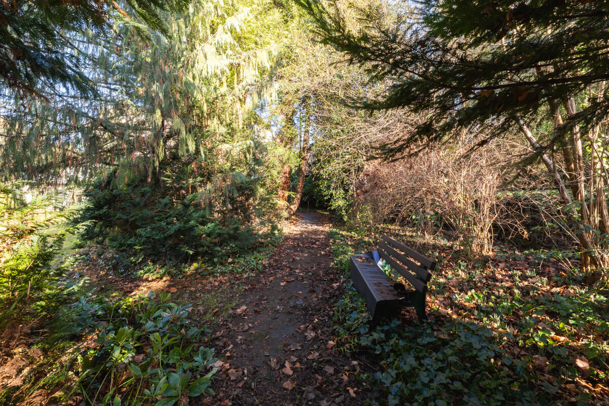 Hinter der zurückhaltenden Straßenansicht öffnet sich ein parkähnliches Grundstück, das den Blick einerseits auf die freistehende Villa und andererseits in Richtung Rhein freigibt. Hier erschließt sich die besondere Atmosphäre dieses Ortes: ruhig, gewachsen und angenehm privat.
