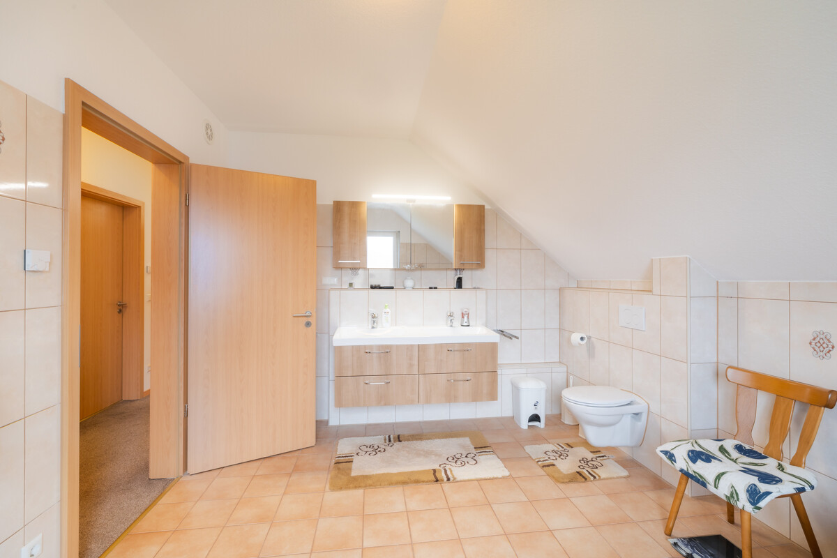 Besonders ist das barrierefreie Zimmer im Erdgeschoss und das nahegelegene Duschbad (Falls das Treppensteigen schwer fällt). Im Obergeschoss befinden sich ein Elternschlafzimmer, das durch eine angrenzende Bibliothek, die auch als Ankleide genutzt werden kann, ergänzt wird, sowie zwei Kinderzimmer. Ein großes Elternbad und ein Kinderduschbad sorgen für Komfort und Privatsphäre, ideal für die große Familie, die Wert auf Privatsphäre legt.