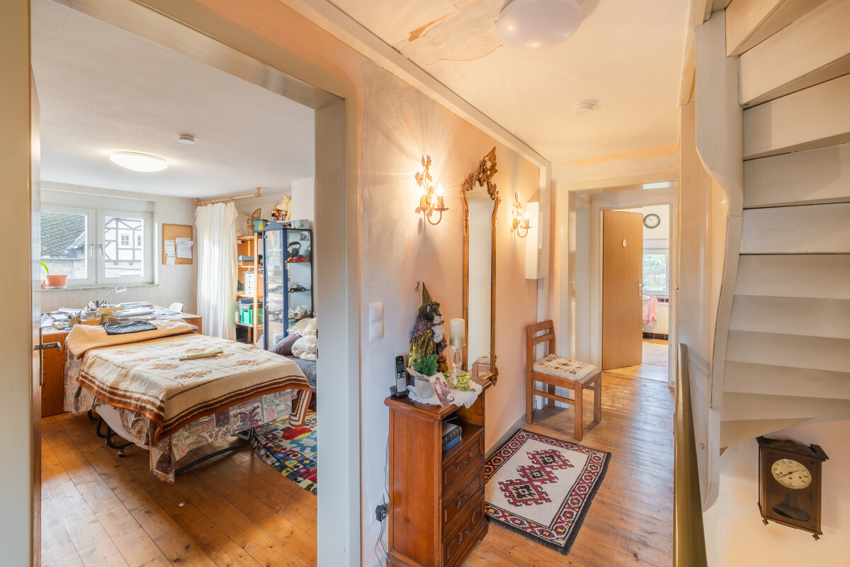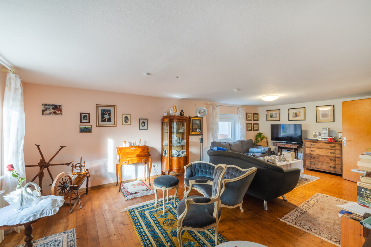 Das Wohnhaus bietet ca. 108 m² Wohnfläche und drei Zimmer – ideal für alle, die ein gemütliches Zuhause suchen und keine Scheu vor Renovierungsarbeiten haben. Die niedrigeren Raumhöhen entsprechen der Bauzeit und verleihen dem Haus eine behagliche Atmosphäre.