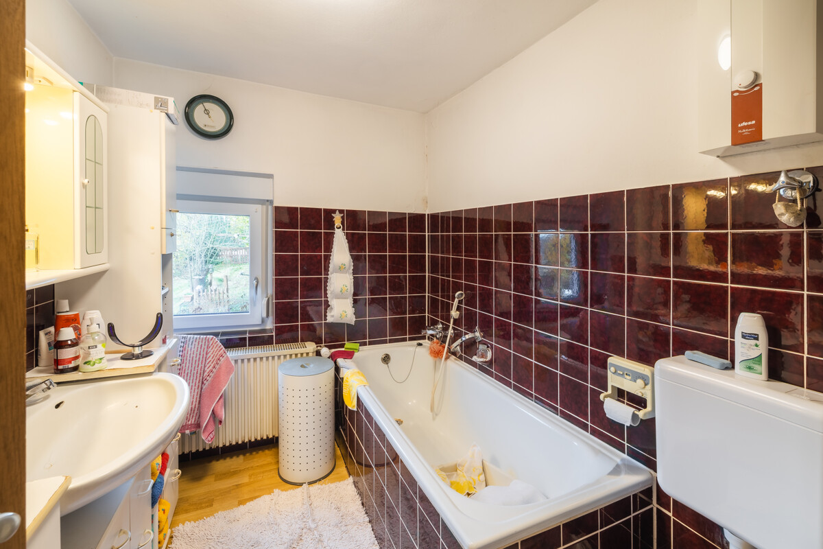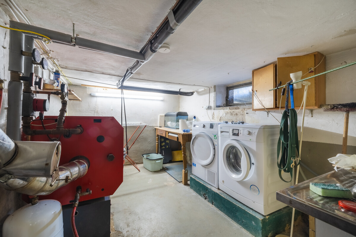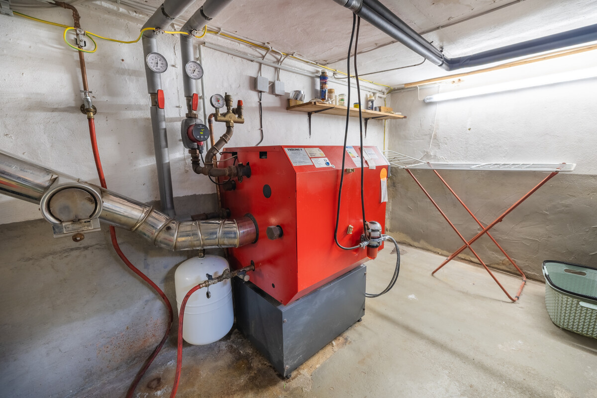 Unter dem Altbau liegt ein niedriger Kellerraum, der Anbau verfügt über zwei höhere Kellerräume – darunter der Heizungsraum mit Ölheizung (Brenner 2020 erneuert). Warmwasser wird über Elektrogeräte erzeugt.