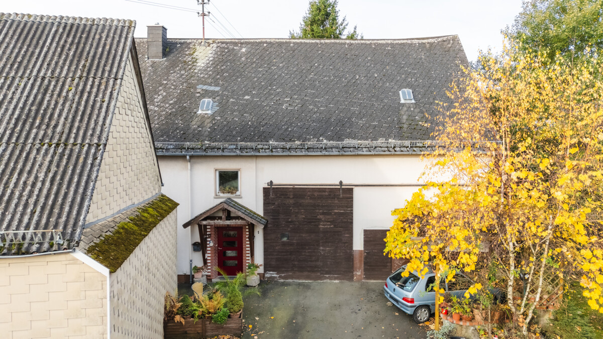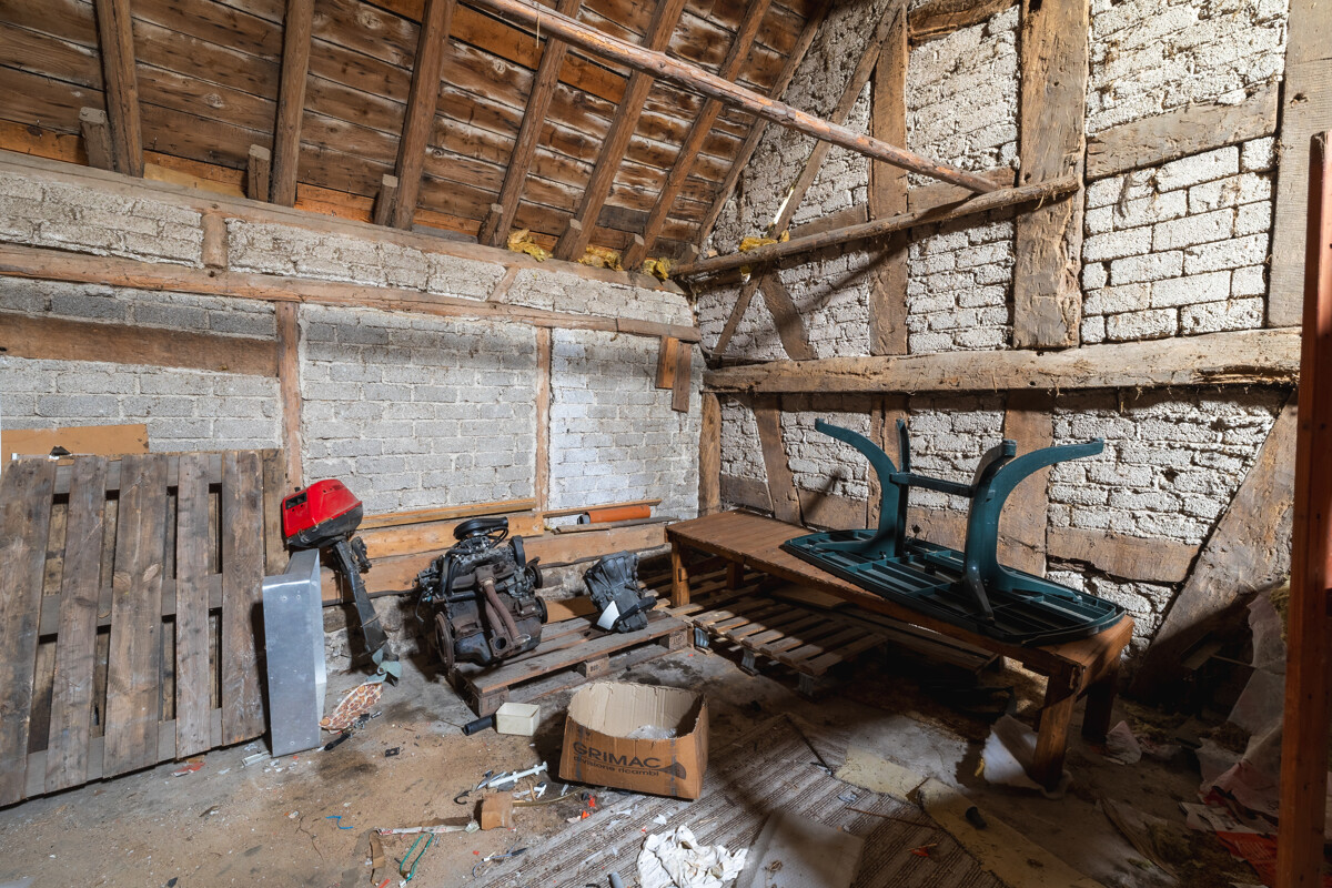 Ein echtes Highlight: die direkt angrenzende, hohe Scheune. Im ursprünglichen Zustand, mit Tenne und altem Kuhstall, bietet sie Handwerkern und Hobbybastlern reichlich Raum für Projekte. Ein Teil wurde als Lagerfläche für Heizöl abgetrennt. Hinter dem Wohnhaus schließt ein Anbau mit ehemaligem Schweine- und Hühnerstall sowie ein alter Schuppen an – groß genug, um langfristig sogar einen Wohnhausumbau in Betracht zu ziehen.