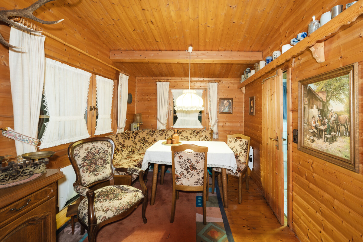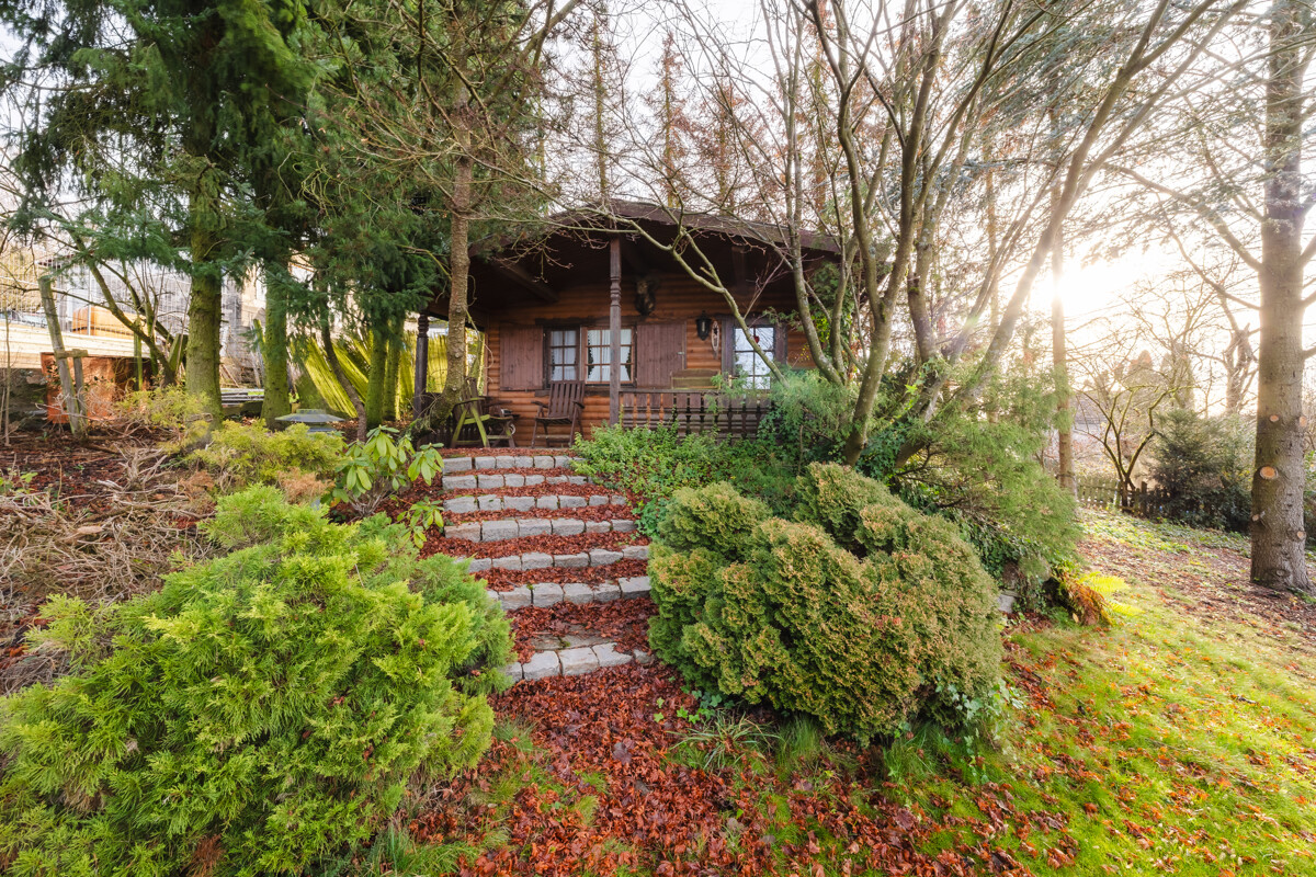Ein besonderes Extra ist die separate Gästehütte im Garten. In gemütlicher Holzoptik gehalten, verfügt sie über einen Aufenthaltsbereich sowie ein eigenes Duschbad – ideal für Gäste, als Rückzugsort für Jugendliche oder als Hobby- und Freizeitbereich.