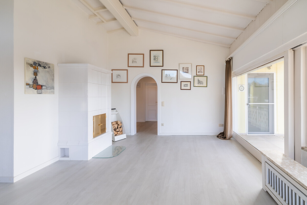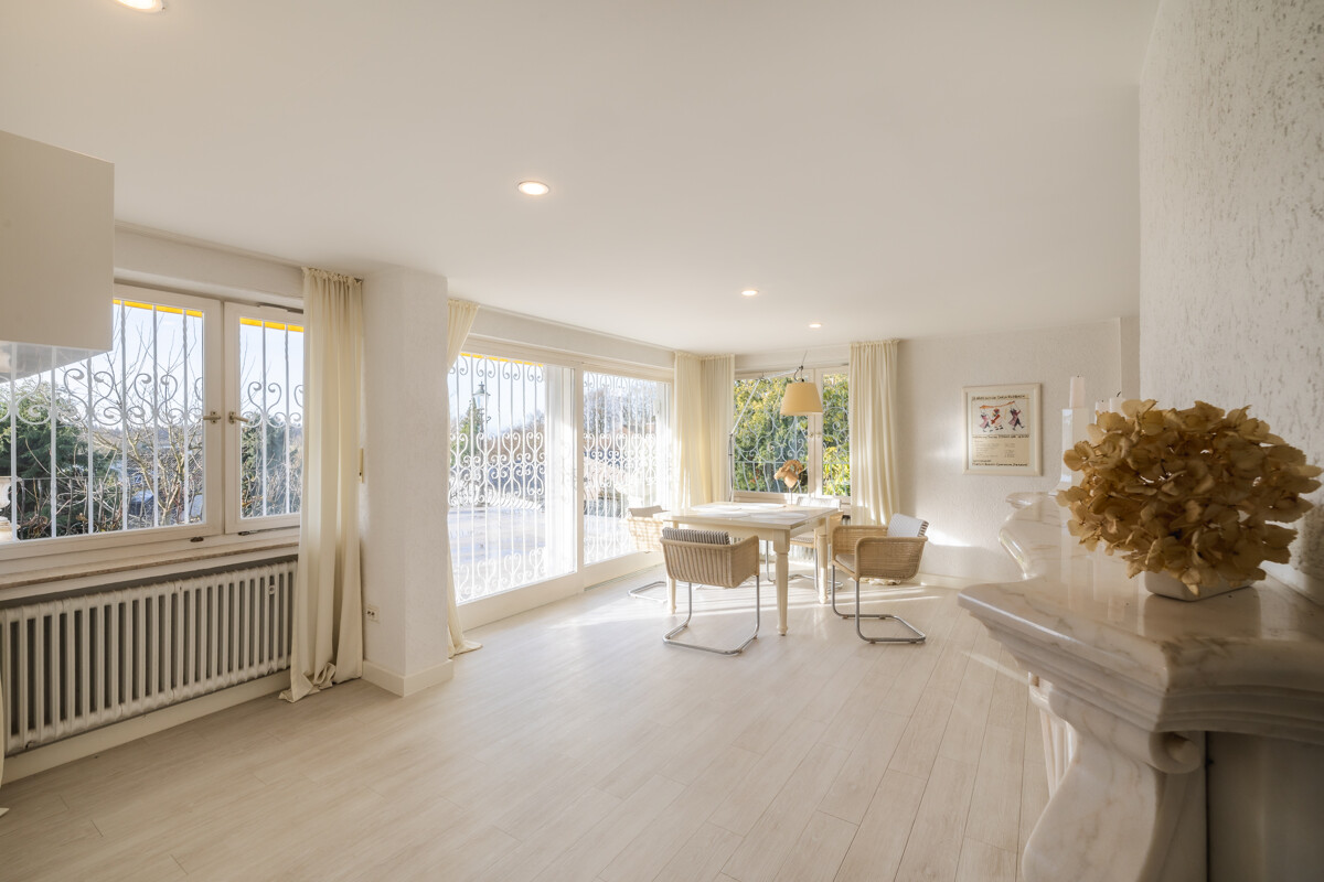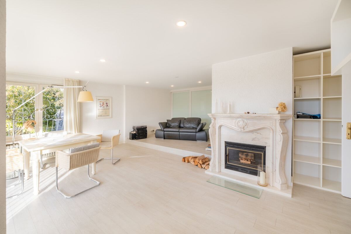 Auch das Gartengeschoss bietet echte Wohnräume und überrascht mit Großzügigkeit und Licht. Hier befindet sich ein weitläufiger Wohnbereich mit großer Fensterfront und direktem Zugang auf die großzügige Terrasse. Durch die Glasflächen überzeugt auch dieser Bereich mit viel Tageslicht und schönem Weitblick. Ein Marmorkamin im Wohnbereich rundet auch hier das Wohlgefühl ab.