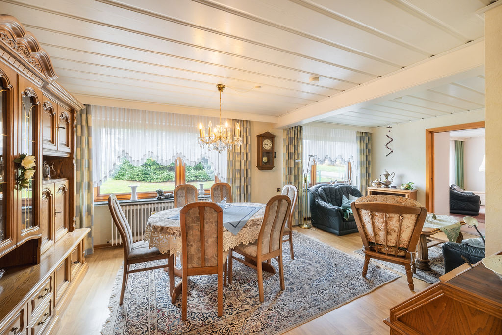 Vom Esszimmer aus geht es fließend über ins gemütliche Wohnzimmer. Das Schlafzimmer im Erdgeschoss wurde aus gesundheitlichen Gründen hier eingerichtet und ist über einen Durchbruch mit dem Wohnzimmer verbunden.