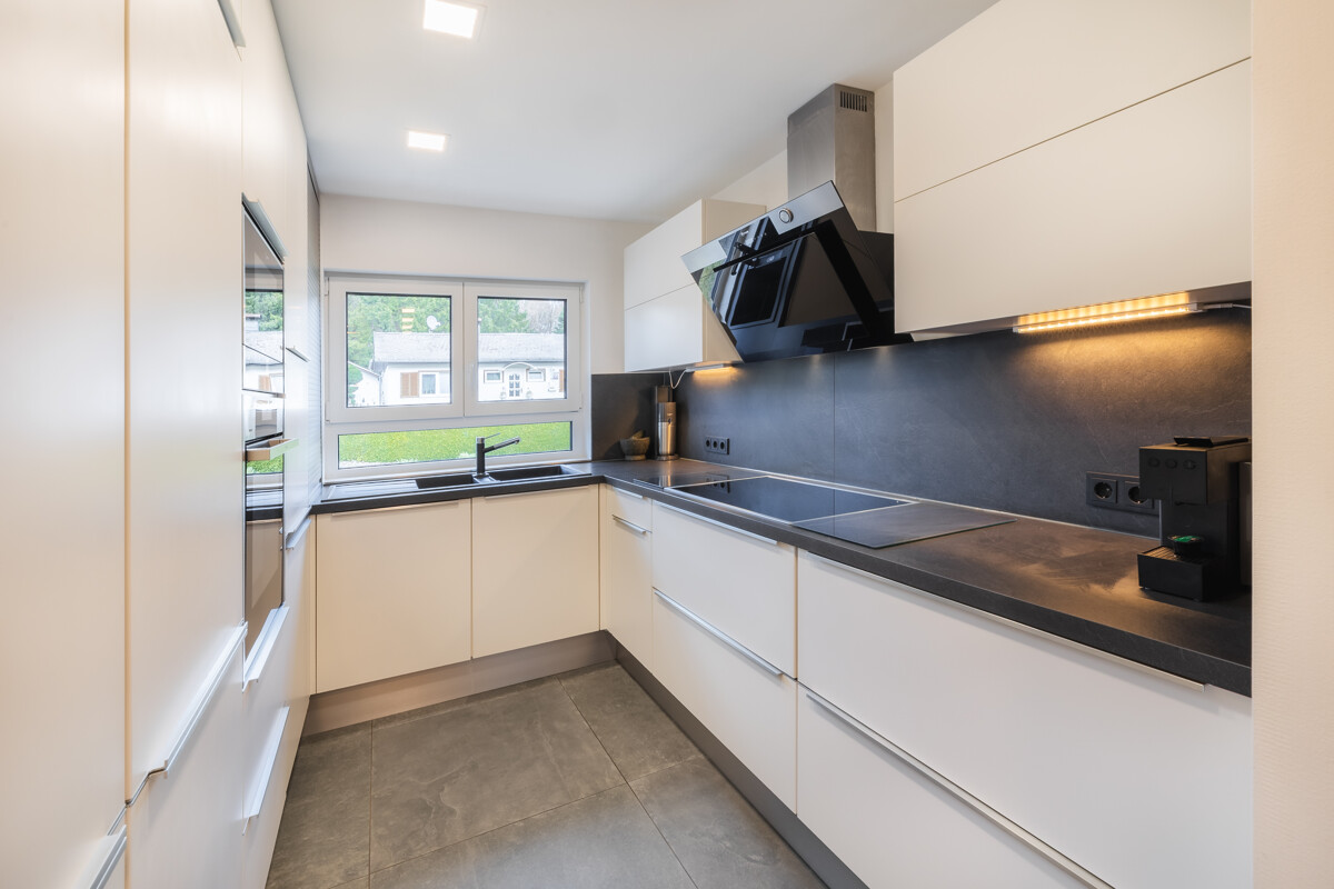 Die Küche ist modern gestaltet und perfekt auf die Gegebenheiten des Raumes abgestimmt. Hier wurde mitgedacht – und zwar bis ins kleinste Detail. Klare Linien, durchdachte Lösungen und jede Menge Platz machen diesen Bereich zu einem echten Lieblingsort für alle, die gerne kochen, genießen und zusammenkommen.