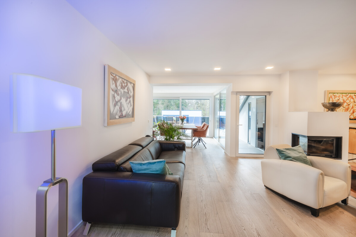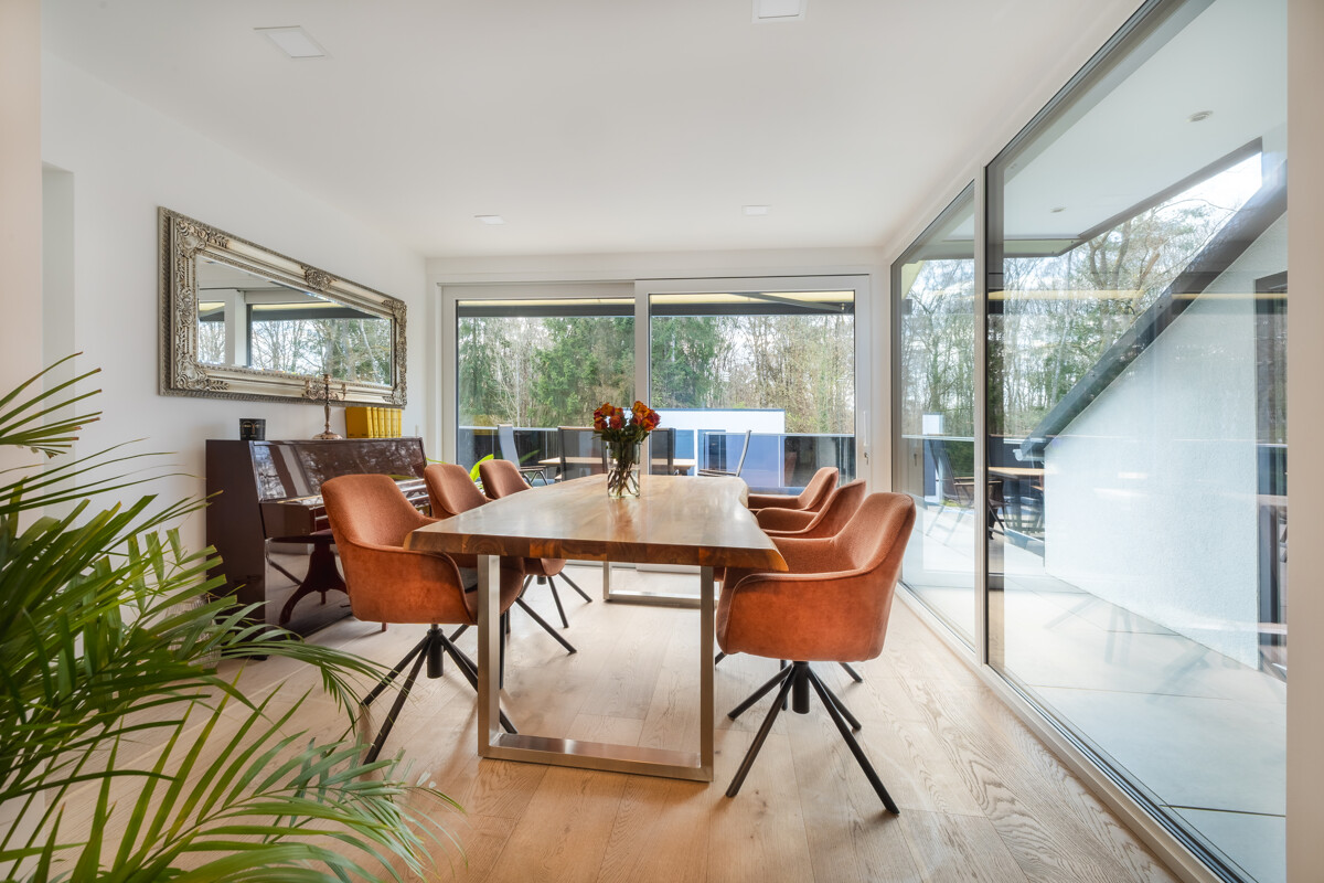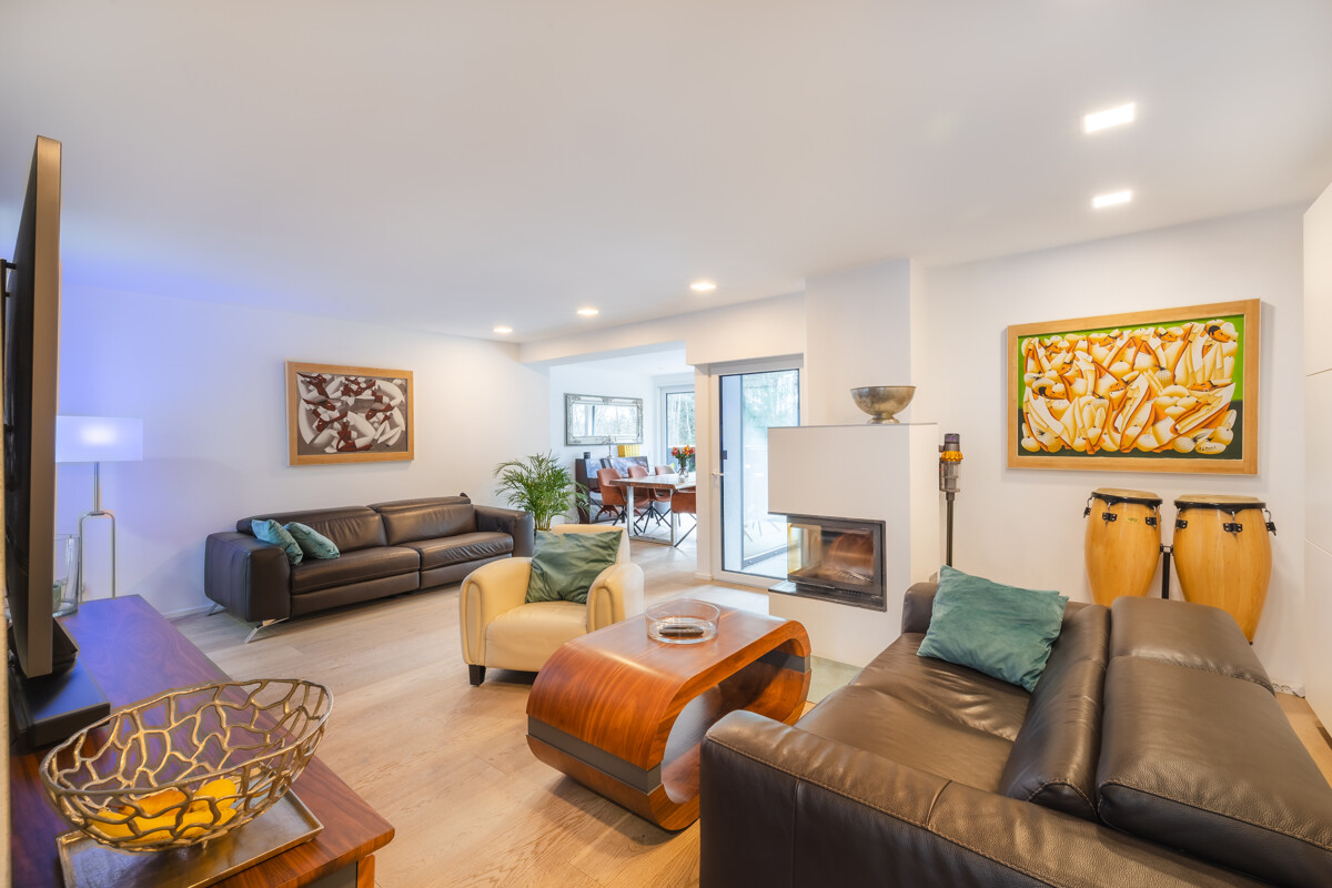 Das Herzstück ist der großzügige Wohnbereich mit Kamin – der perfekte Ort für gemütliche Abende, gute Gespräche und dieses wohlige „Zuhause-Gefühl“. Direkt angrenzend: der Essbereich mit großen Fensterflächen und Zugang zur Terrasse. Hier wird nicht nur gegessen – hier wird gelebt. Familienessen, Geburtstage, Sommerabende… Sie sehen es schon vor sich, oder?