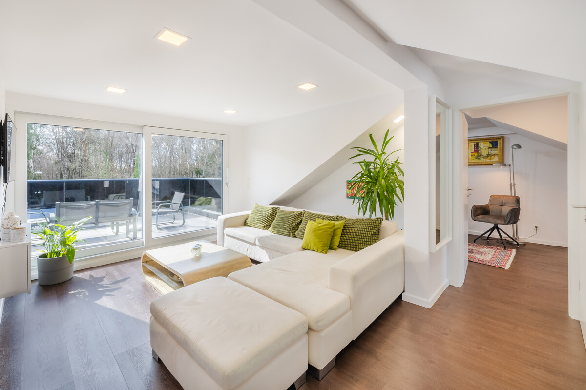 Und dann kommt ein echtes Highlight: die große Terrasse im Obergeschoss. Ein wunderbarer Ort für eine kleine Auszeit, den ersten Kaffee am Morgen oder den letzten Sonnenstrahl am Abend.