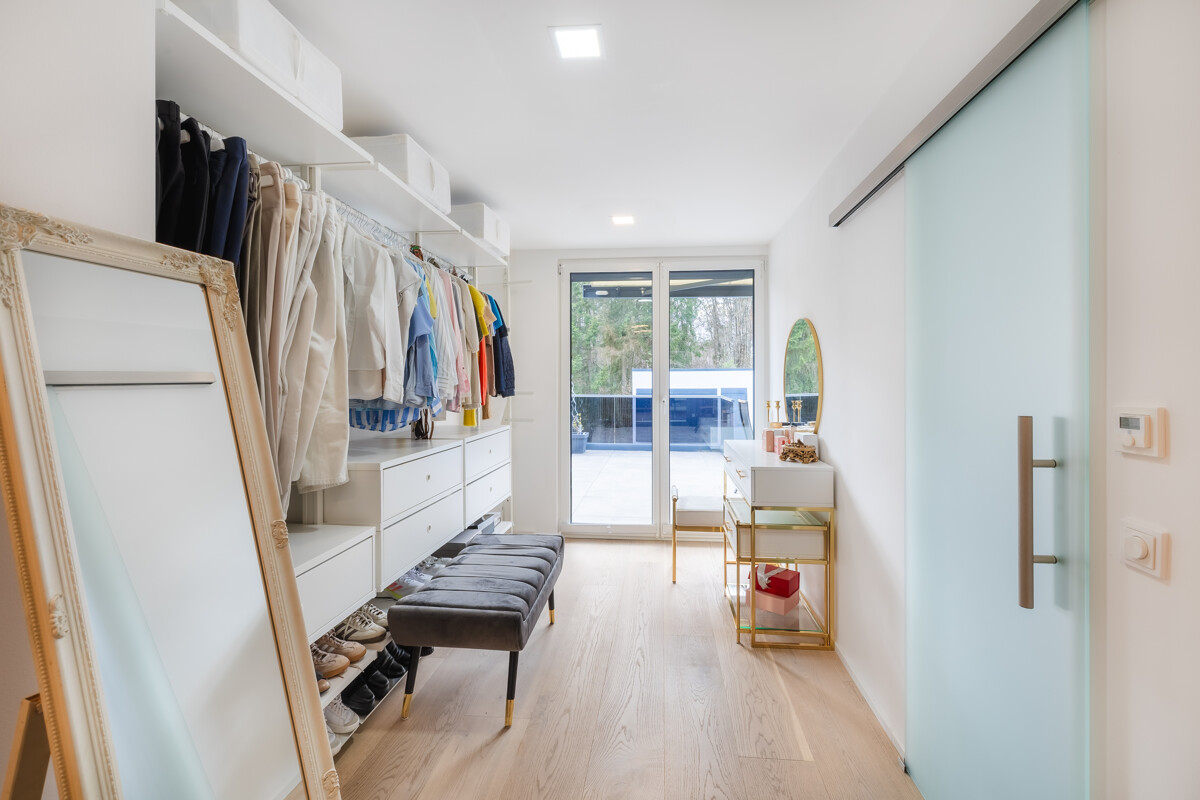 Dazu kommen im Erdgeschoss weitere flexibel nutzbare Räume – ob Schlafen, Arbeiten oder Gäste empfangen: Sie entscheiden. Besonders charmant und praktisch zugleich: die Ankleide, die für Ordnung sorgt und morgens Zeit spart. Ein Badezimmer auf dieser Ebene rundet das Ganze sinnvoll ab.