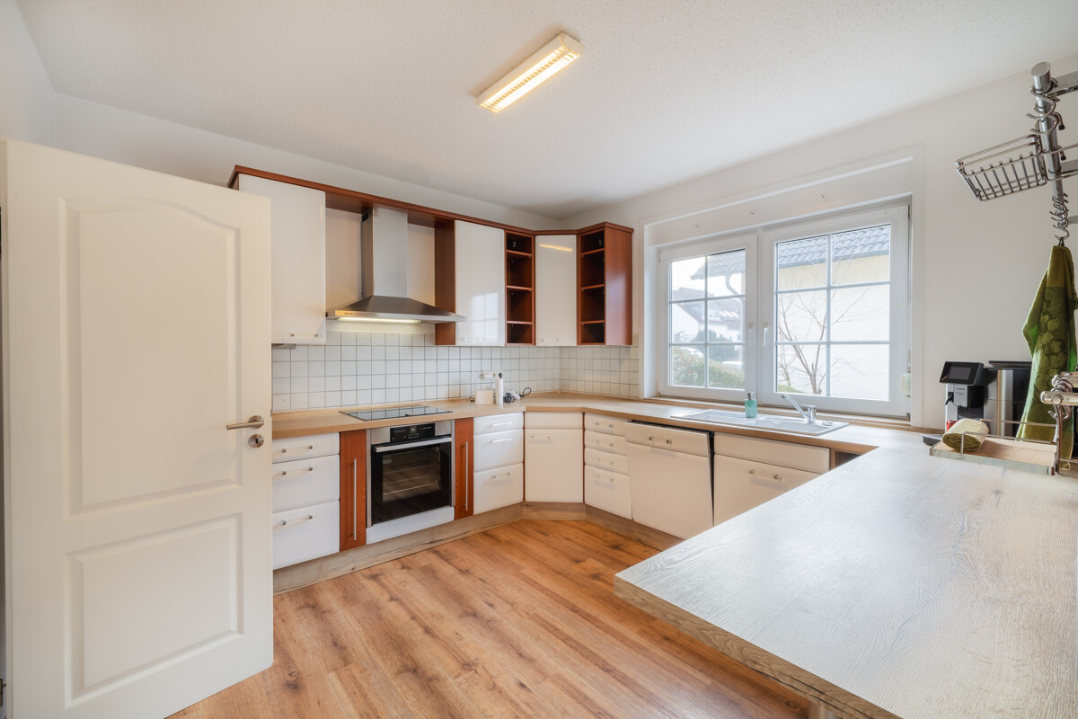 Die separate Küche ist funktional geschnitten und bietet gute Arbeitsflächen sowie angenehmes Tageslicht. Sie ermöglicht Struktur im Alltag, während der Wohn- und Essbereich als zentraler Treffpunkt der Familie dient.