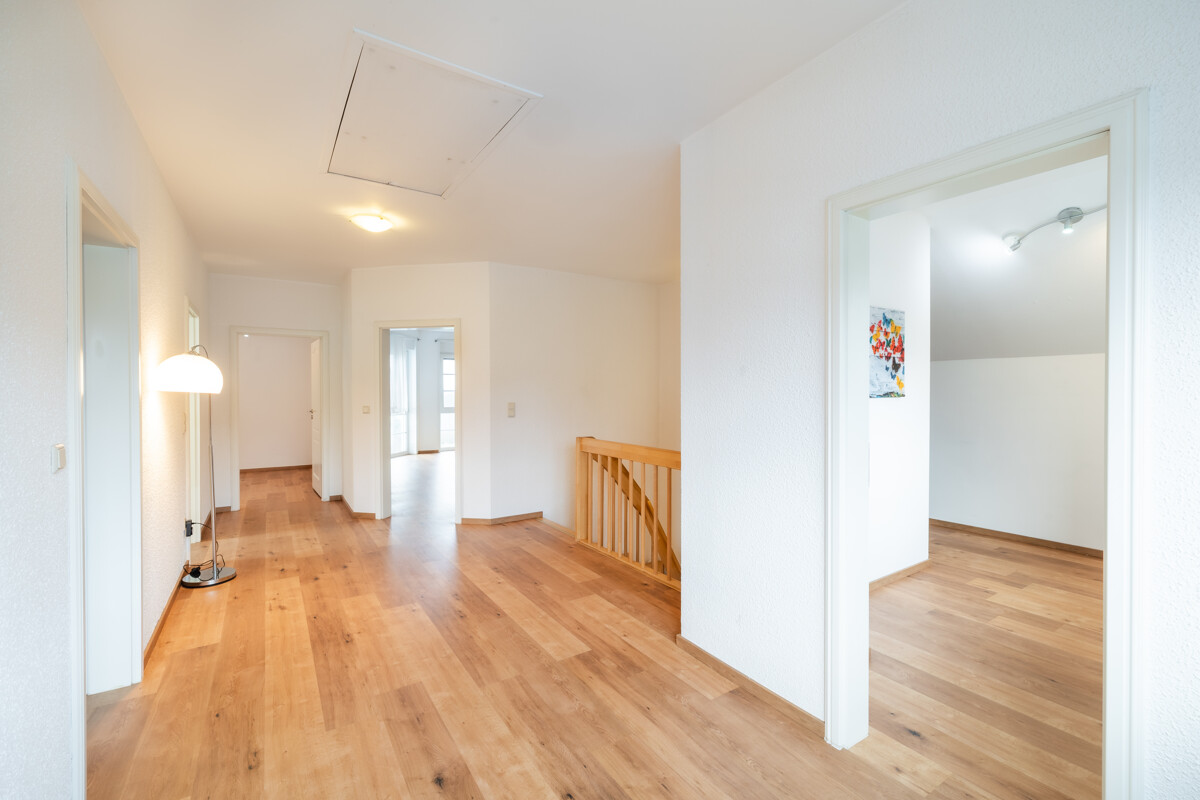 Im Obergeschoss verbindet ein großzügiger Flur die weiteren Zimmer dieser Etage. Drei Räume stehen flexibel zur Verfügung – als Elternbereich, Kinderzimmer, Homeoffice oder Gästezimmer. Das helle Badezimmer mit Badewanne bietet ausreichend Platz für den Familienalltag. Ein Abstellraum schafft Platz für eigene Ideen.