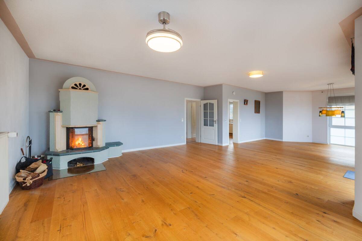 Der großzügige Wohn- und Essbereich bildet das Herzstück des Hauses. Große Fensterflächen lassen viel Tageslicht herein und schaffen eine angenehme Leichtigkeit. Der Kamin sorgt in der kühleren Jahreszeit für behagliche Wärme – genau diese Art von Gemütlichkeit, die man sich an langen Abenden wünscht. Von hier aus gelangen Sie auf den großzügigen und überdachten Balkon. Ob Kinderlachen, Grillabend mit Freunden, oder einfach ein ruhiger Moment mit Blick in die Weite – hier fühlt sich Zuhause sein richtig gut an.