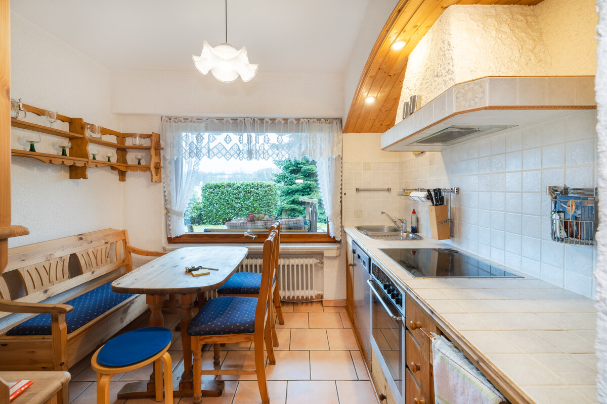 Die separate Küche bietet gemütlichen Platz für den Alltag und kurze Wege beim Kochen. Ergänzt wird diese Wohnebene durch ein Elternschlafzimmer, ein Kinderzimmer sowie ein Badezimmer mit Badewanne. Die Räume lassen sich funktional und familienfreundlich nutzen.